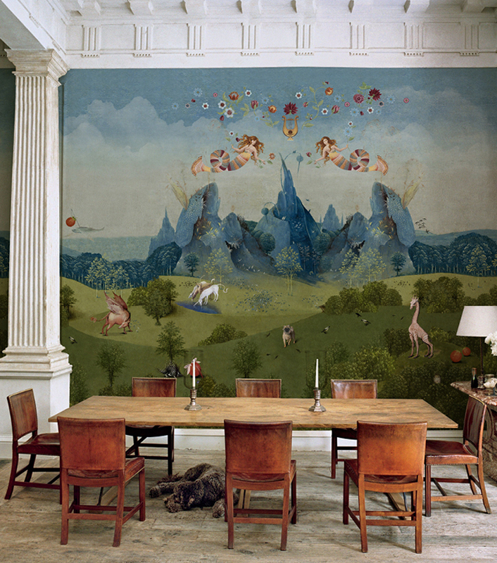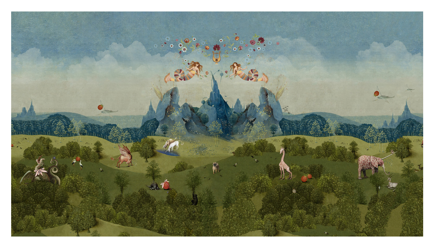« Le papier peint Hieronymus Fantasy réinvente le panneau gauche du Jardin des délices de Bosch. C’est un voyage dans une terre imaginaire. Un décor de montagnes et de ciels bleu céruléen domine des forêts verdoyantes et des collines ondoyantes. Dans ce royaume, chaque créature, bien que familière, adopte une essence fantastique. »