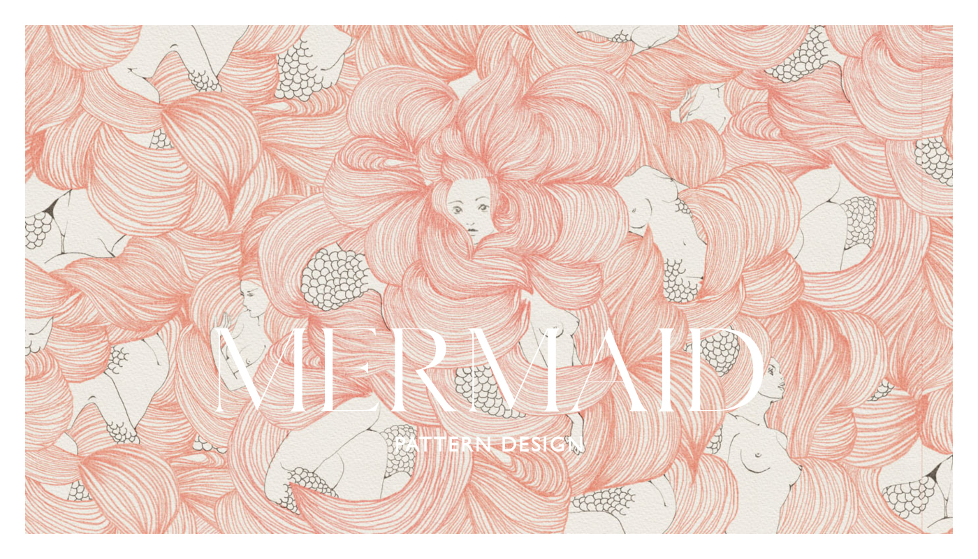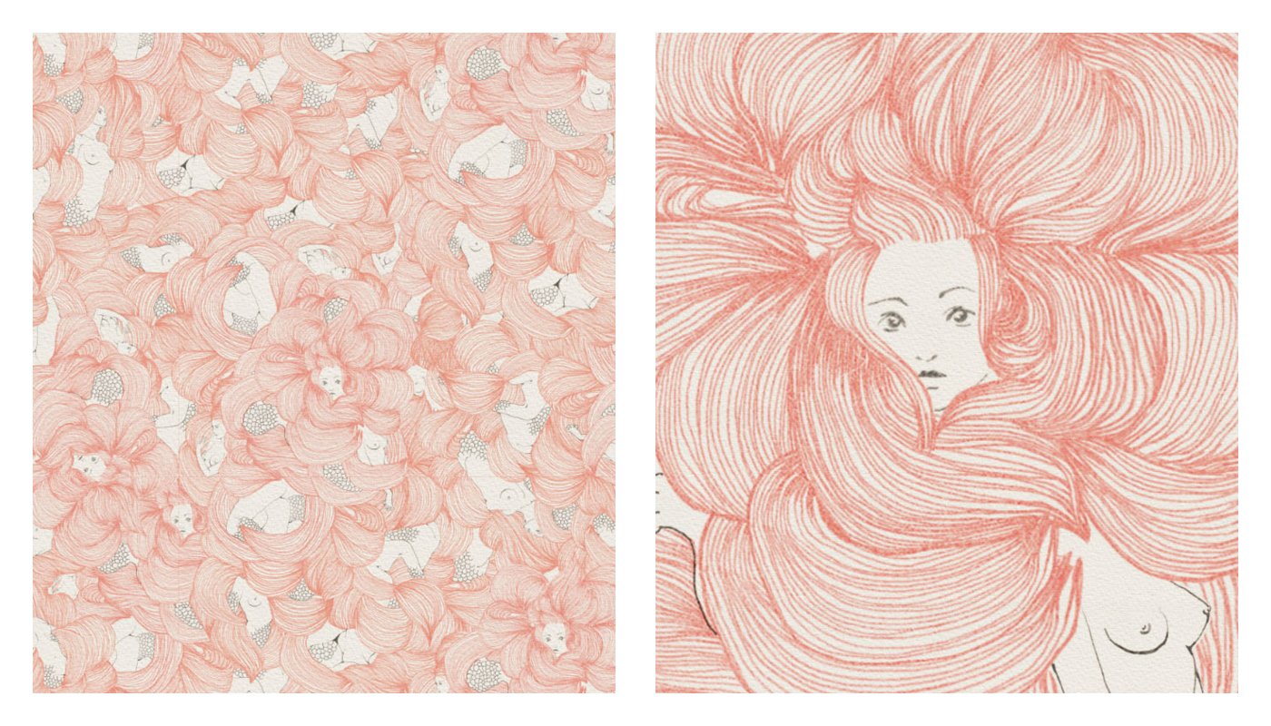 Une mer de cheveux ondulants et de courbes souples dérive dans une lumière corail — les corps se dissolvent en vagues, des écailles fleurissent là où la peau respirait. Entre mouvement et immobilité, la femme devient océan, abandonnant sa forme à une grâce fluide. Une métamorphose silencieuse, qui se replie sans fin sur elle-même.
